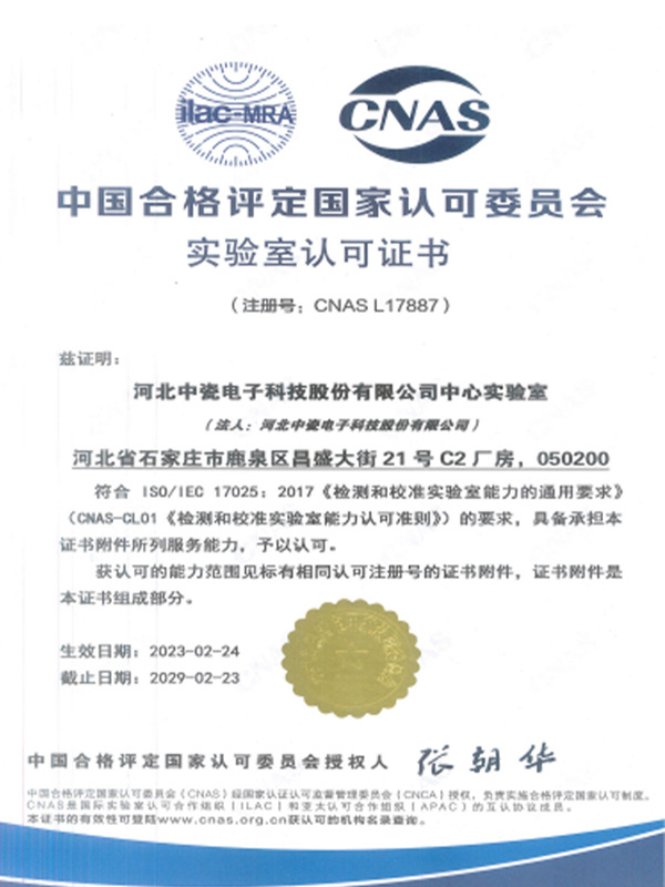 中瓷自主建设可靠性实验室,并于2023年24项试验通过了国家CNAS体系认证,全方位、专业化实施产品相关所有可靠性测试、失效分析及原材料性能分析,为产品质量保驾护航。